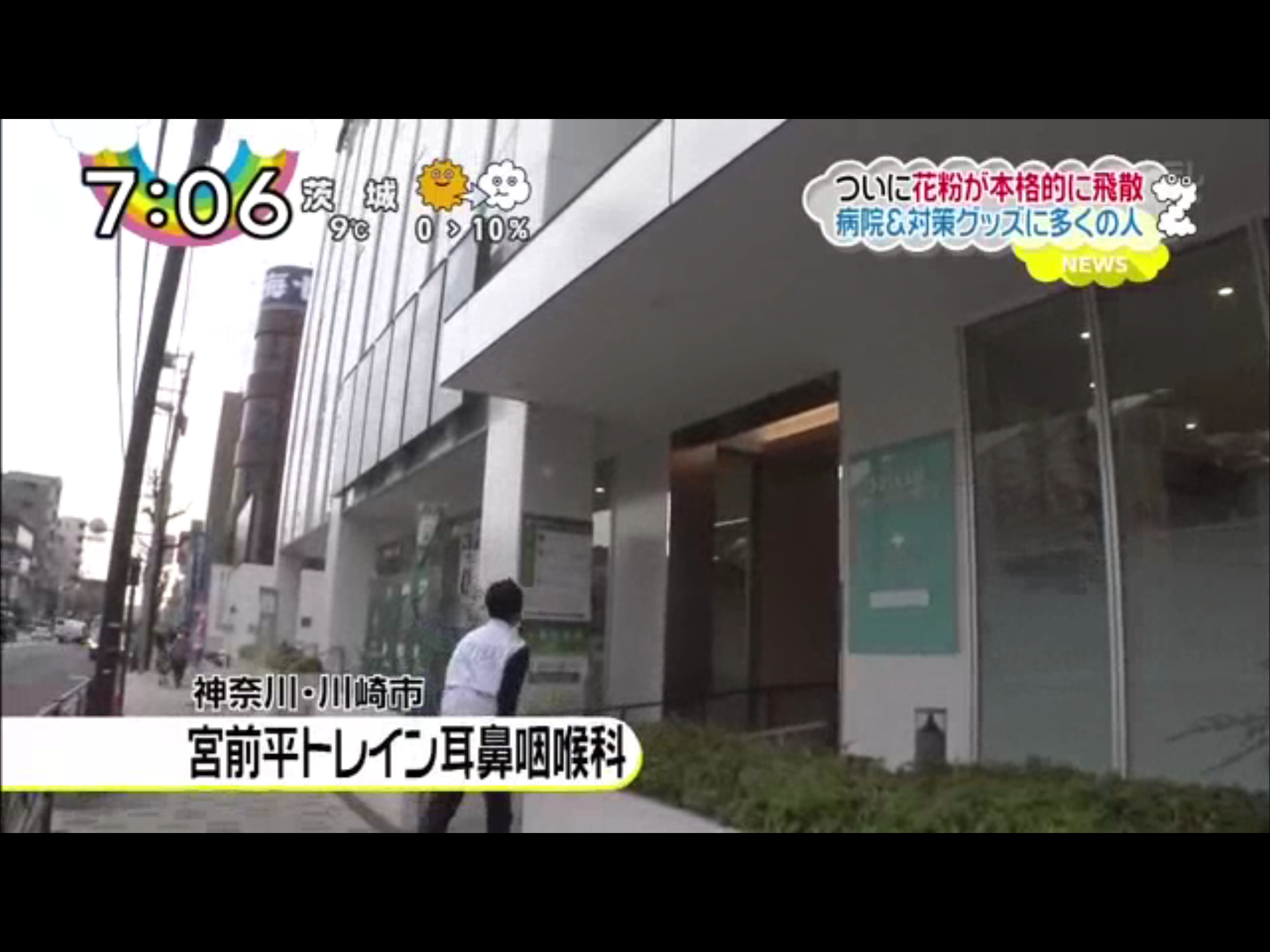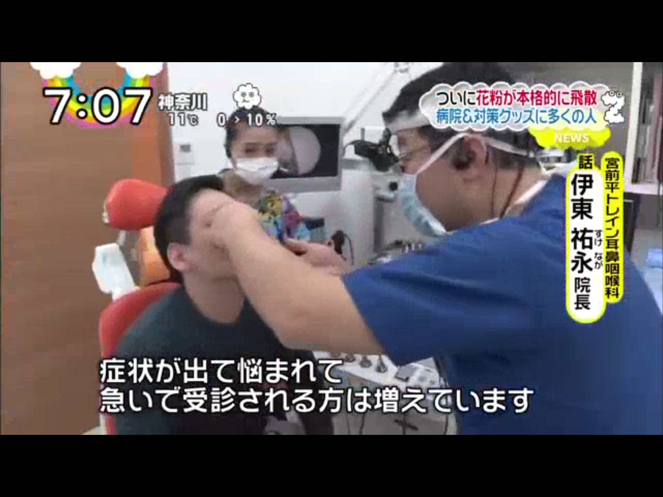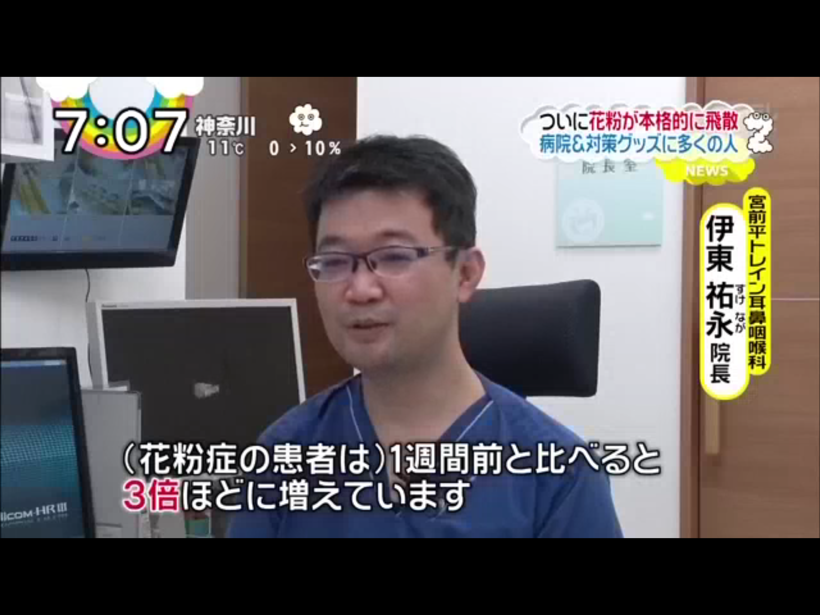 番組でも取り上げていましたように、スギ花粉の飛散が本格的になっています。すでにかなりの方が症状出ていると思いますが、是非ひどくなる前に来院ください。少しでも早い治療開始が、花粉症シーズンを楽に過ごすためには重要です。今年は「眠くなく、効果の高い花粉症治療」を宮前平トレイン耳鼻咽喉科でお受けください。