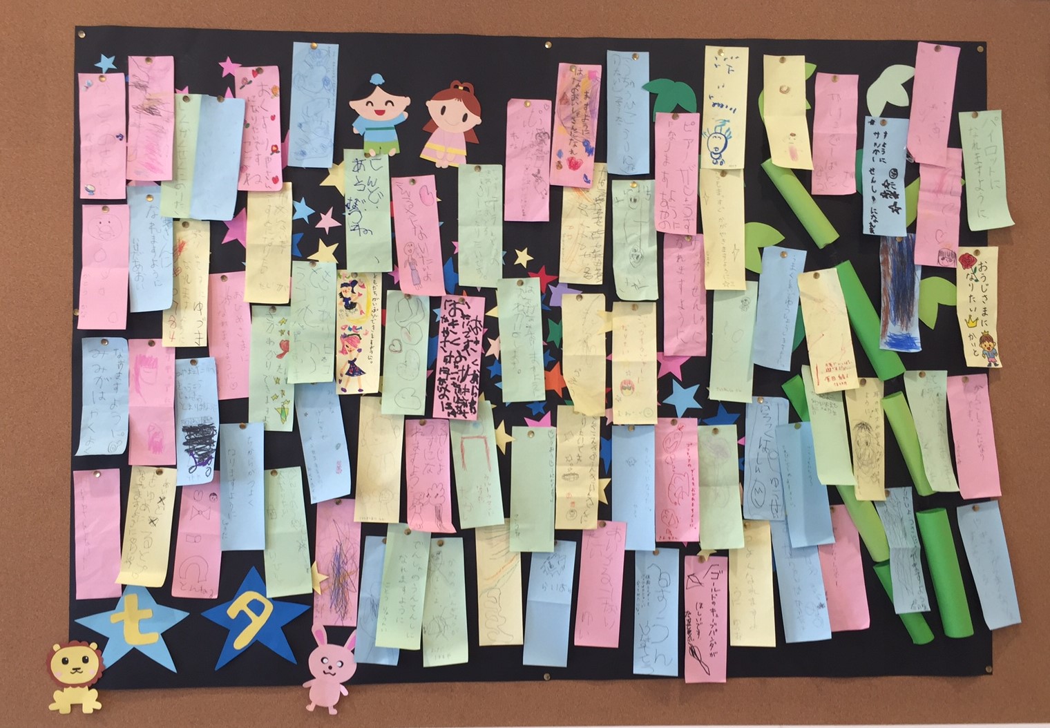 願い事の短冊はすべて読ませていただきました。「○○になれますように」と言った子供らしいお願いごとが最も多かったです。なりたいものとしては、「まま」「かんごし」「けいきやさん」「あいどる」「プリキュア」「おひめさま」「プリンセス」「えるさ」「おはなやさん」「おくすりやさん」「はなのおいしゃさん」「ジュウオウジャー」「カービィー」「おうじさま」「ウルトラマン」「かめんらいだーごーすと」「パイロット」「うちゅうひこうし」「サッカーせんしゅ」「がっこうのせんせい」などがありました。