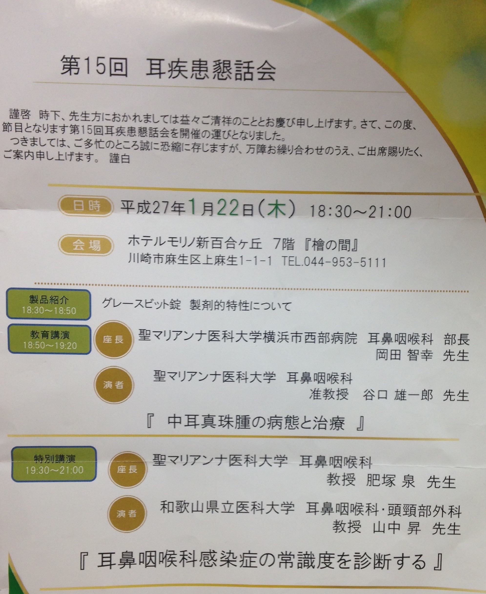 さて、雨だった22日の木曜は午後が休診でした。新百合ヶ丘で聖マリアンナ医大耳鼻科が開いてくださった勉強会が夜にあり参加してきました。