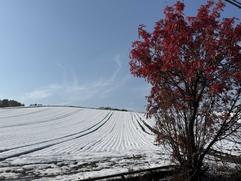 山や畑の上にはまだ白く雪が積もっていて、秋と冬が入り混じっているよう。