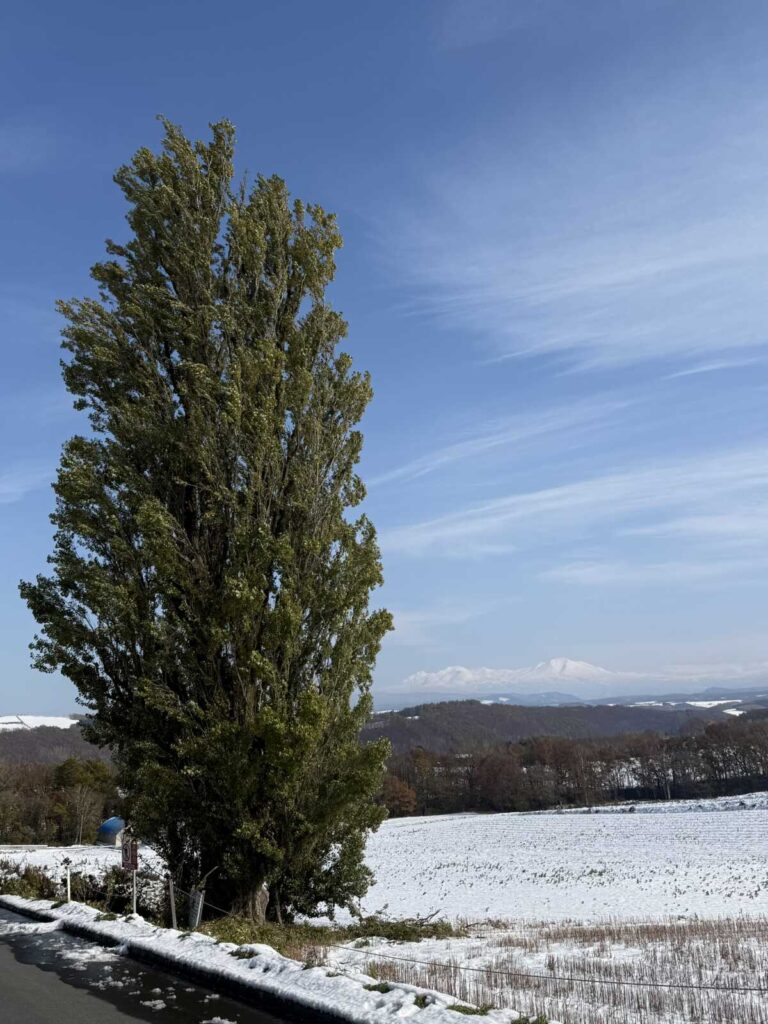 レンタカーを走らせると、丘の上にうっすら雪が残っていた。