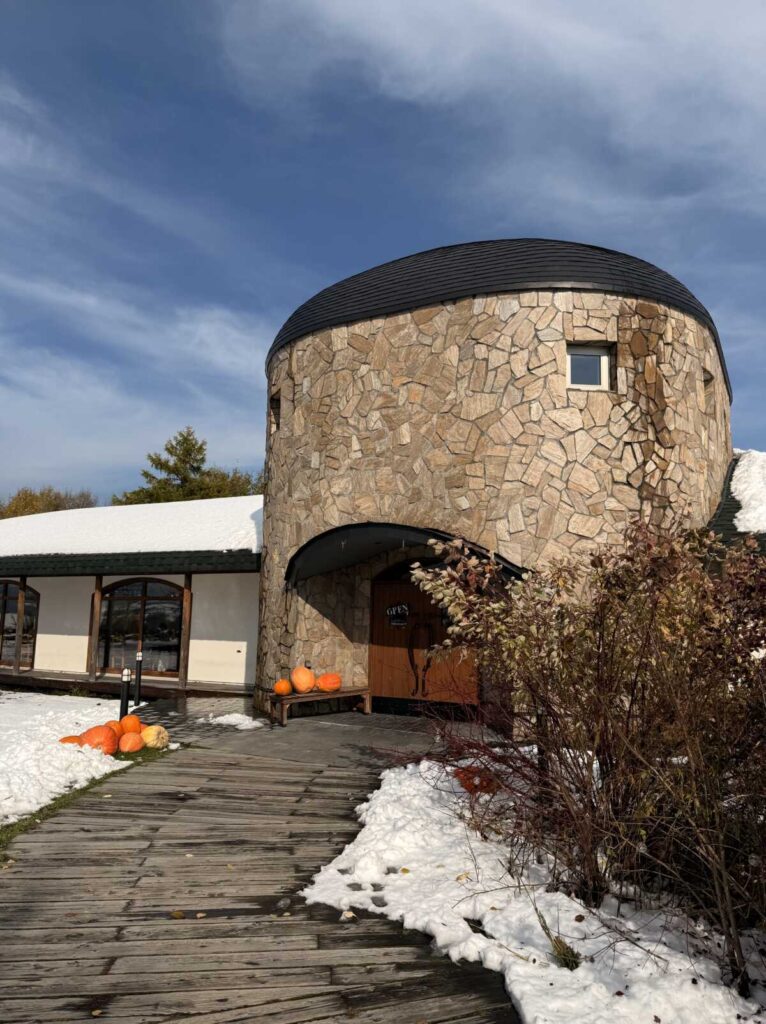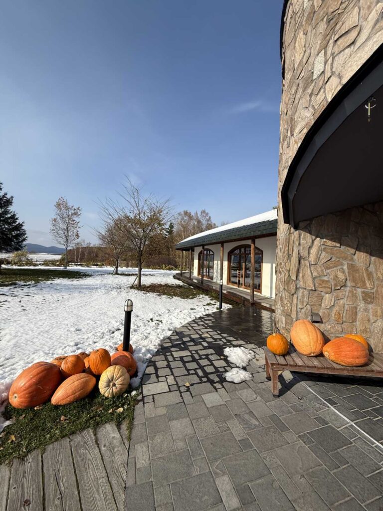 11時半、雪をかぶった畑の先にレンガ造りの建物が見えてくる。