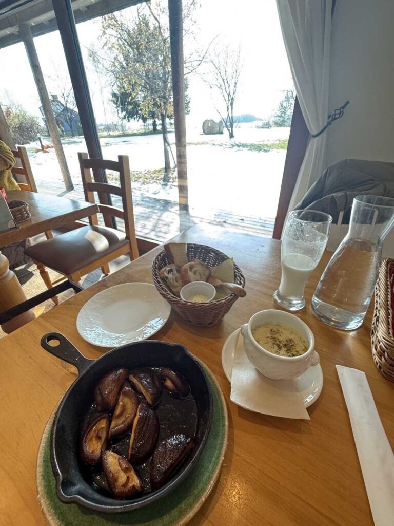 薪の香りと焼きたてパンの匂いが、外の冷たい空気と混じり合う。