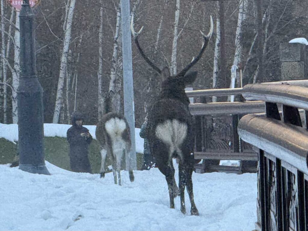 帰り道では温泉街の歩道に鹿のペアが現れた。