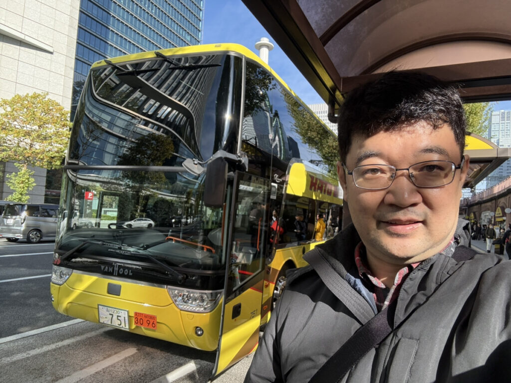 連休最終日の朝、東京駅に停まる黄色い二階建てバス——
