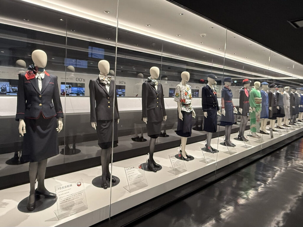 歴代制服、航空機の部品、JALの歩みを示すパネル──