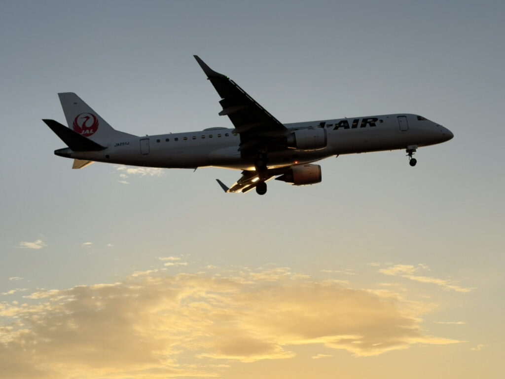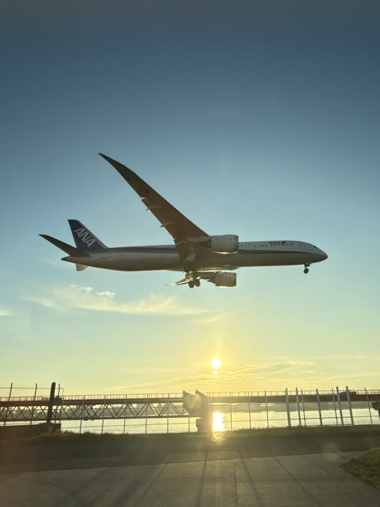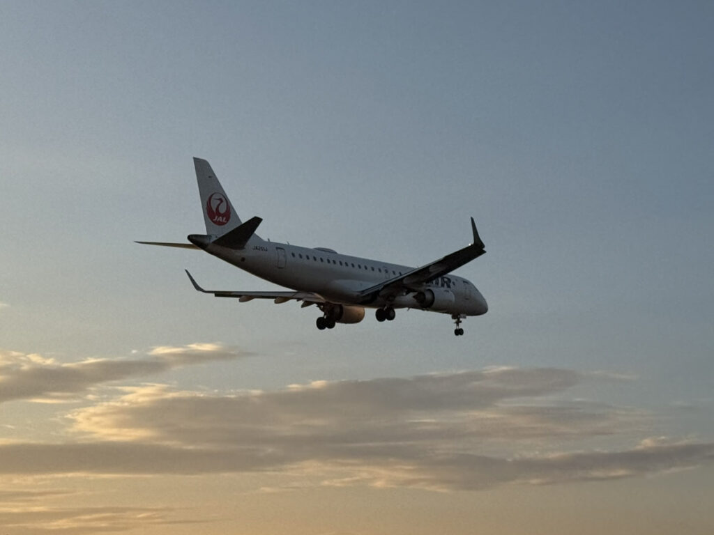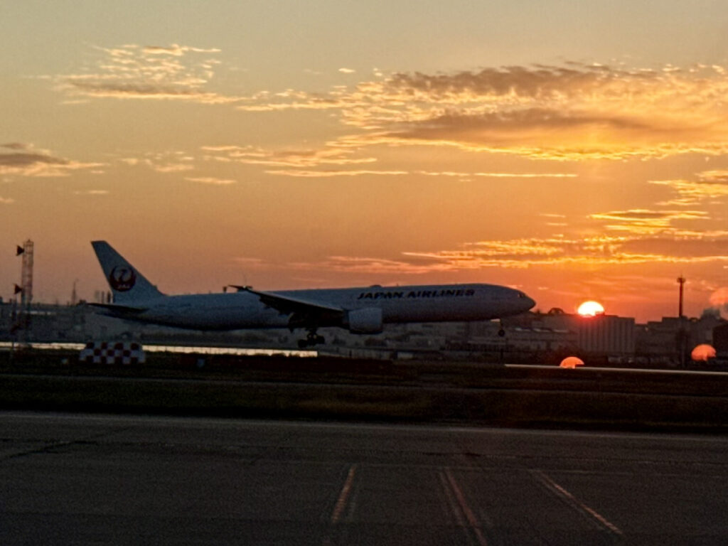 夕陽がちょうど水平線に近づいたタイミングで降りてきたJAL機。