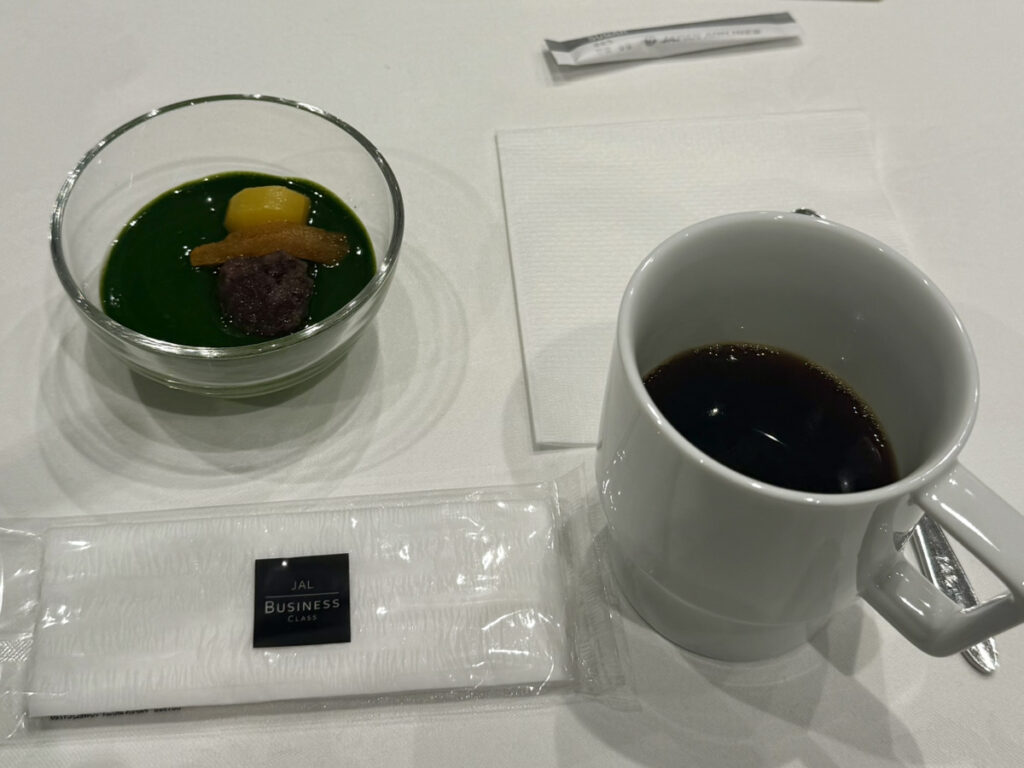 韓国→日本線ビジネスクラスで提供される抹茶プリンが配られた。