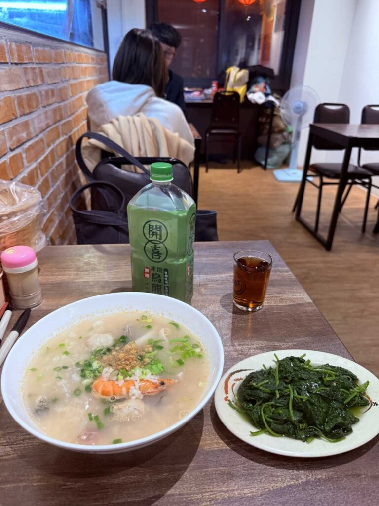 注文したのは、招牌海鮮粥 160台湾元(≒800円)と、燙青菜 50台湾元(≒250円)。青菜はサツマイモの葉だった。