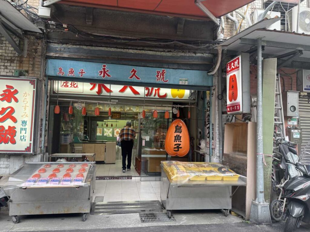 迪化街の永楽市場に到着。1階の食品店をいくつか覗き、食の熱気を感じる。そこから少し歩いた場所にあるカラスミの老舗「永久號」へと向かった。実はここ、AIに勧められた店だ。その情報をちらっと参考にしつつ、自分の目で見極める。周囲には350元の札を掲げる店もあるが、私が選んだのは750元(≒3,750円)の最高級品だ。