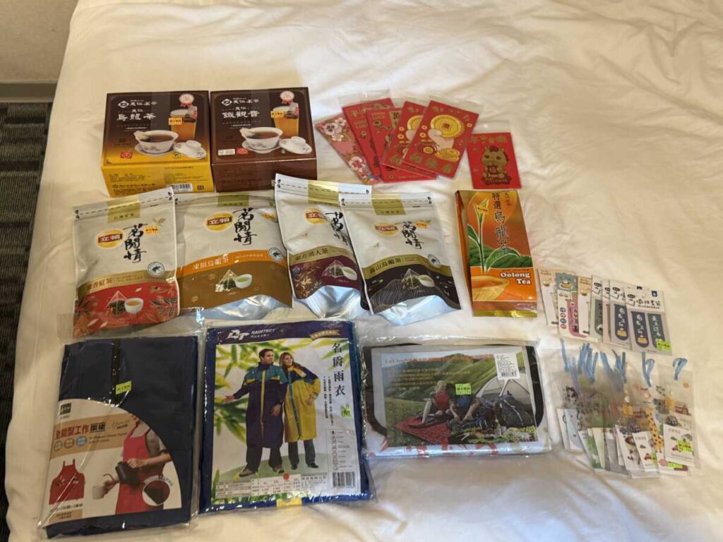 戦利品一式:名爵雨衣(上下カッパ)459元(≒2,295円)、レジャーシート125元(≒625円)、リプトンの台湾限定ティーバッグ、天仁茗茶の烏龍茶・鉄観音、台湾デザインのしおり12枚、ポチ袋(紅包)など。
