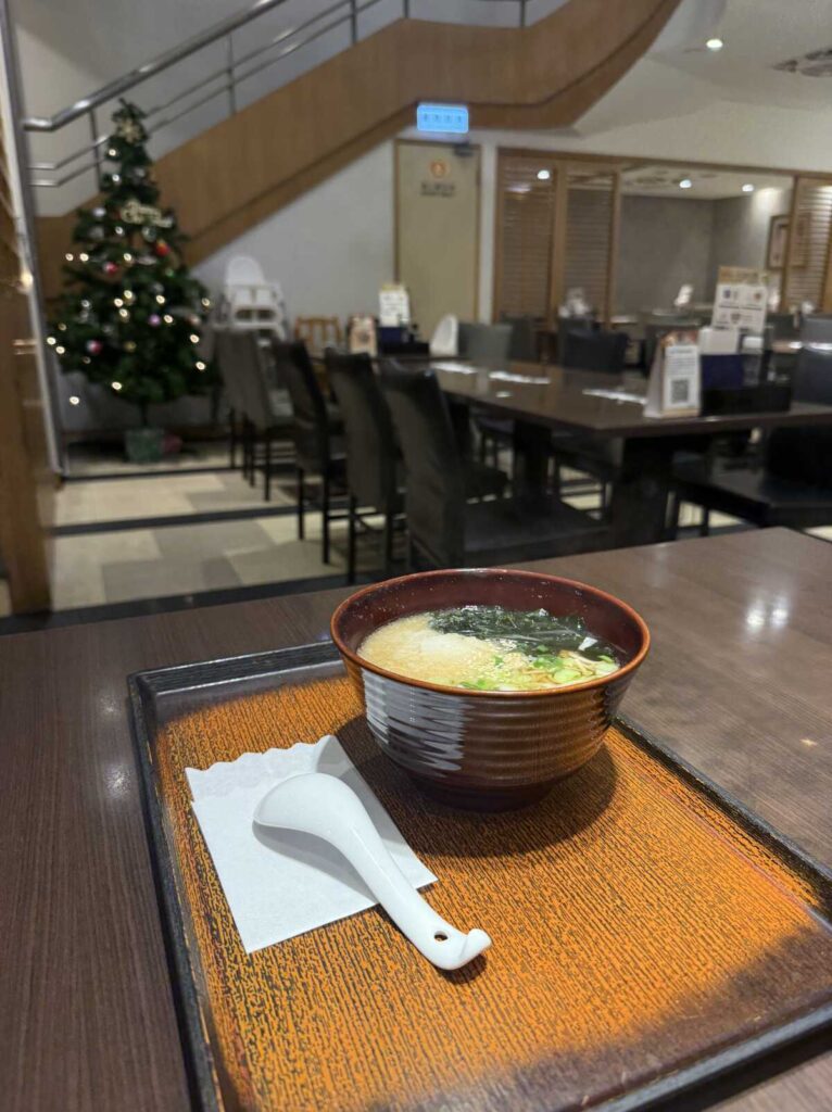 日々の台湾グルメも良いが、今日は大晦日。日本人は、世界のどこにいたって年越し蕎麦を食べなきゃ始まらない。同時に、これは医師としての冷徹なリスク管理でもある。絶対に体調を崩せない長期戦を前に、成分も衛生管理も熟知している「いつもの味」で胃を満たす。この安心感こそが、戦場に向かう前の最高の栄養剤になる。選んだのは蕎麦湯麵(温かい蕎麦)150元(≒750円)。今夜の主役は、あの塔と、雨と、人の熱だ。