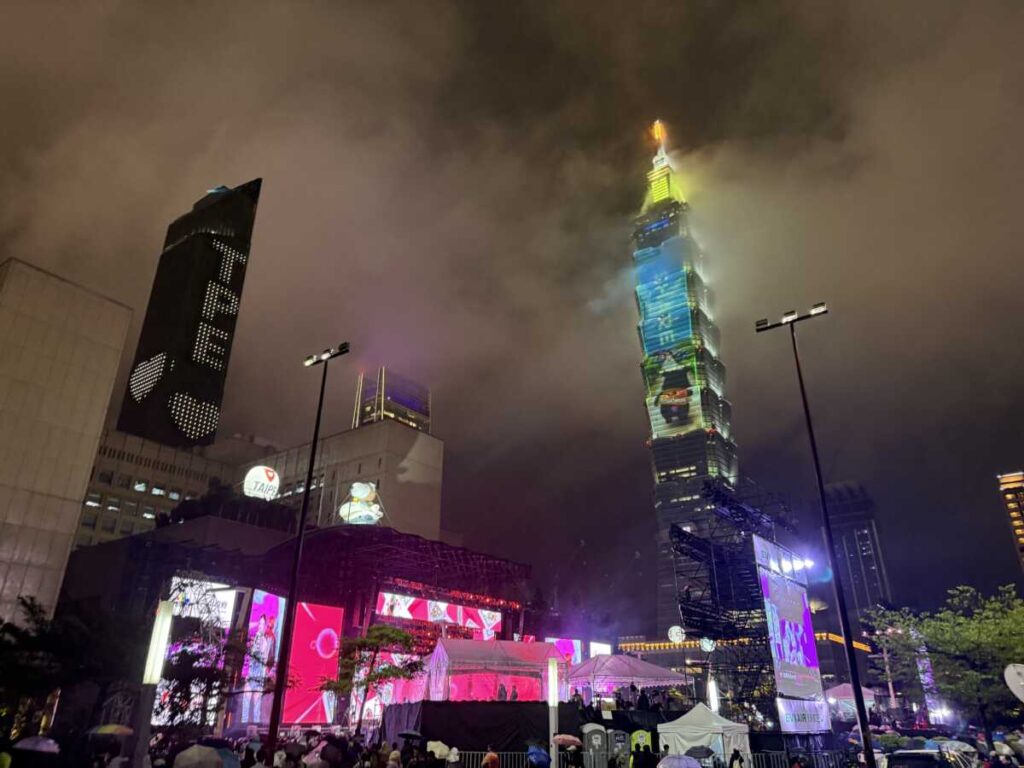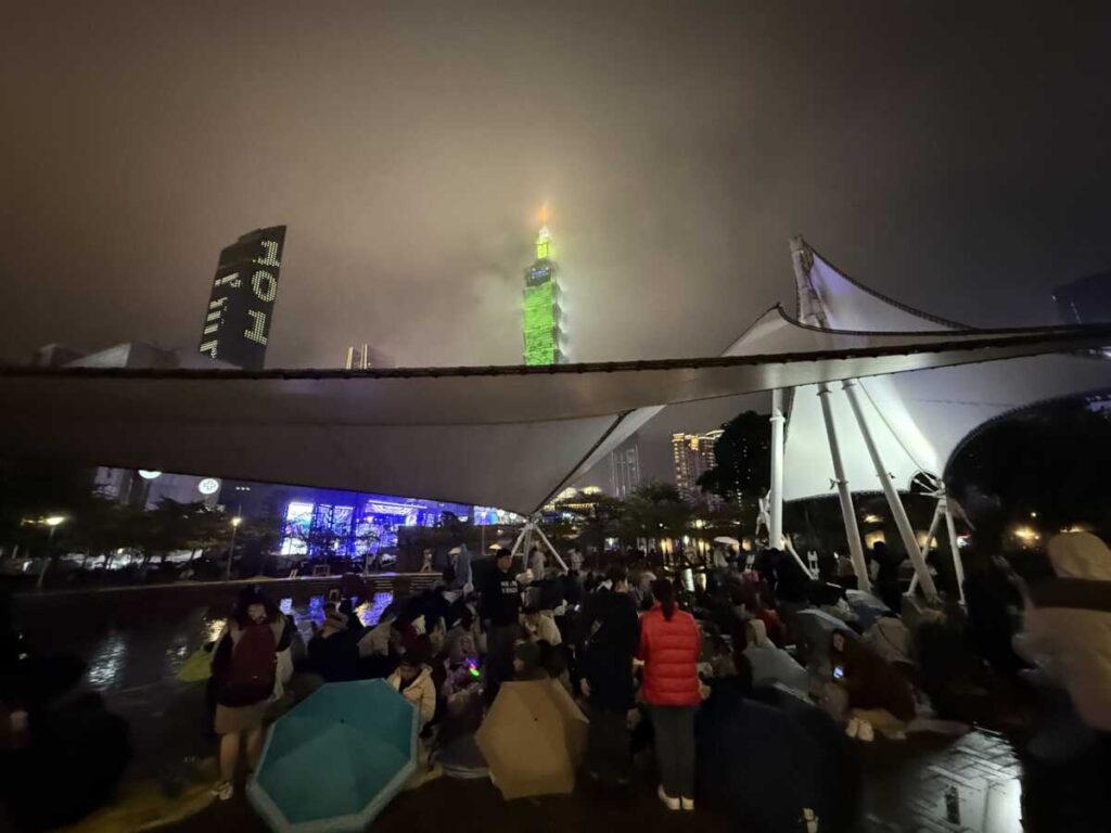 19:30前後、会場周辺へ。狙いは「台北101が正面に見えて、屋根がある場所」だ。私は濡れた地面に防水ゴザを敷き、早い段階で腰を下ろした。雨の日の長時間待機で、立ちっぱなしは体力を削る。座れる人間が最後に残る。屋根の価値は、時間が経つほど上がる。私はそれを知っていたし、実際そうなった。