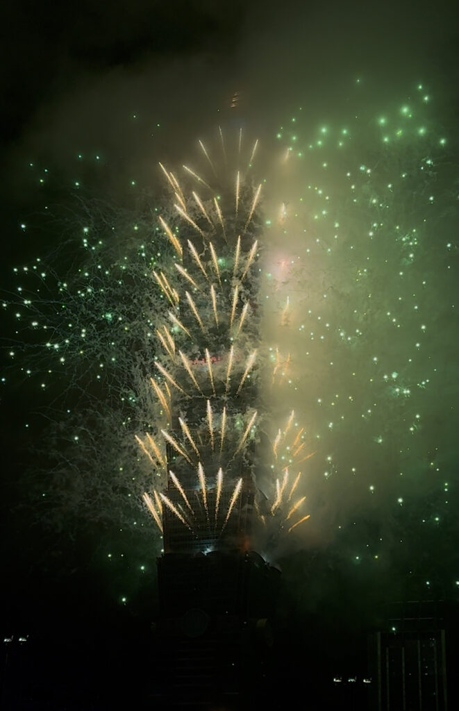 0時、花火が始まった。本降りの雨という、最悪のコンディションだ。だが、私の読みは的中した。4時間かけて風向きや煙の流れを読み、霧に遮られにくい「勝ちポジション」を死守した結果、101の全景が驚くほど鮮明に浮かび上がった。後で聞けば、場所によっては煙で何も見えなかったという悲劇も起きていたようだが、私の視界を遮るものは何もない。