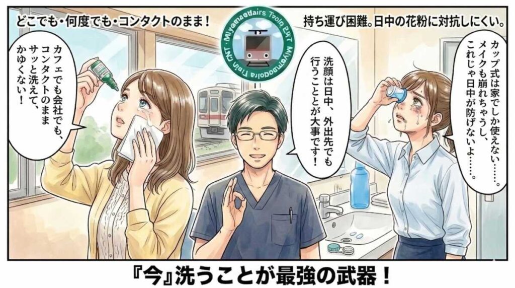 花粉症の目のかゆみ対策で本当に大事なのは、1回だけ気持ちよく洗うことではなく、つらい時に、その場ですぐ洗えることだからです 。