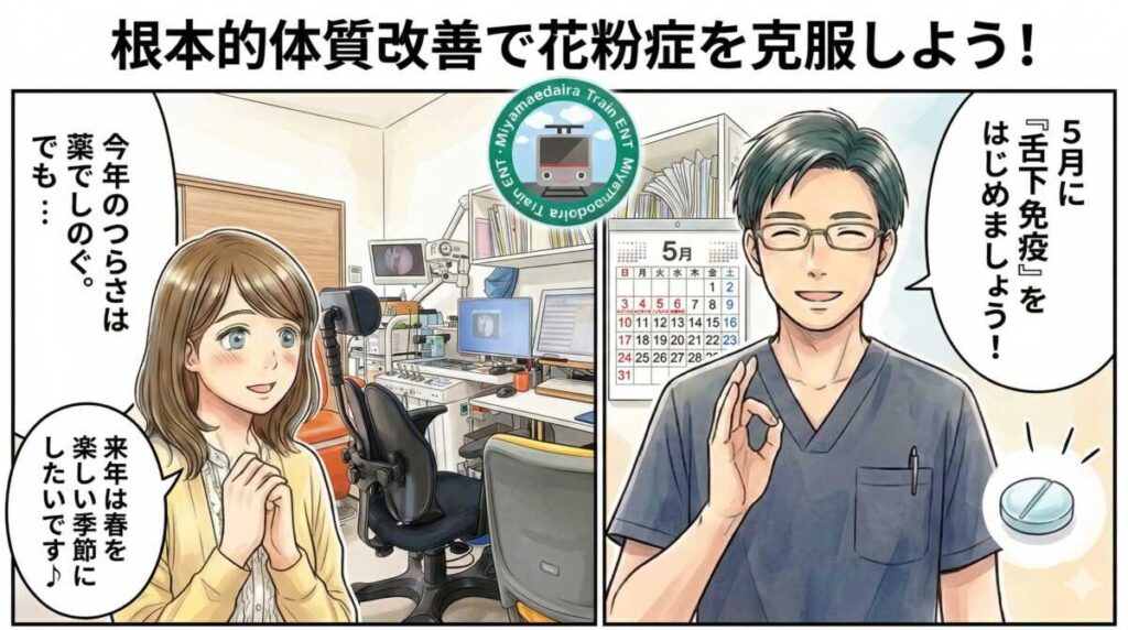 舌下免疫療法は、花粉症体質そのものを治す「根本体質改善治療」です 。鼻症状だけでなく、目の症状にも効果が期待できます。来年の今ごろ、もっと楽に過ごしている自分を作るための治療として、ぜひ考えてみてください。