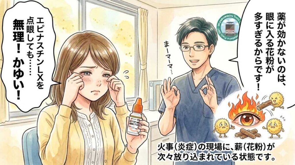 花粉症で、目のかゆみがなかなか治まらない方がいます。エピナスチンLX(1日2回点眼)やアレジオン眼瞼クリーム(1日1回塗布)などの処方薬を使っていても、「全然かゆみが止まらない」と感じる方は少なくありません 。これは、あなたのせいではありません。