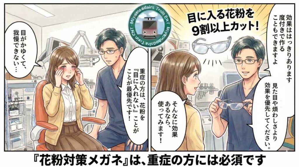 処方薬を使ってもつらい時にまず徹底すべきなのは、洗眼回数を増やすことと花粉対策メガネを使うことです。重症の方ほど、薬を強くする前に「花粉を減らす」ことを本気でやるべきです。
