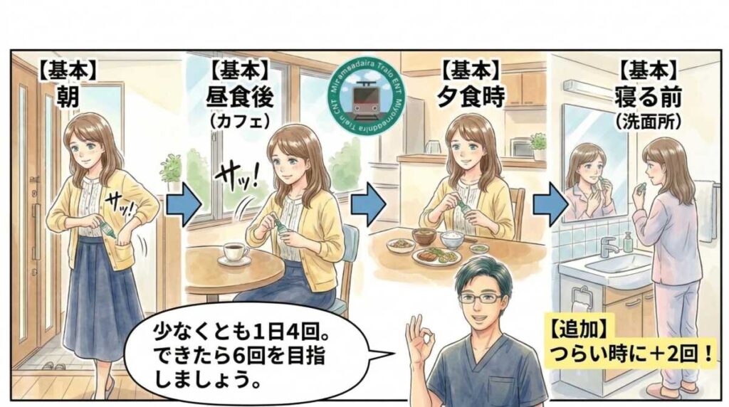 この4回を基本にして、午後につらい時や花粉が多い日は、さらに追加してください。症状が強い方は、合計6回くらいまで増やした方が楽になることが多いです。